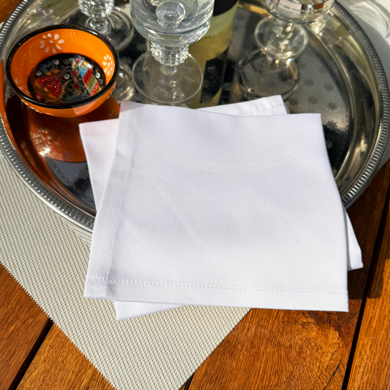 We offer you ten exclusive white fabric cocktail napkins. These elegant napkins without pattern measure 30x30 cm and have a folded size of 15x15 cm, making them very small – ideal for finger food, small snacks, or tasty appetizers that can be taken by hand and enjoyed.