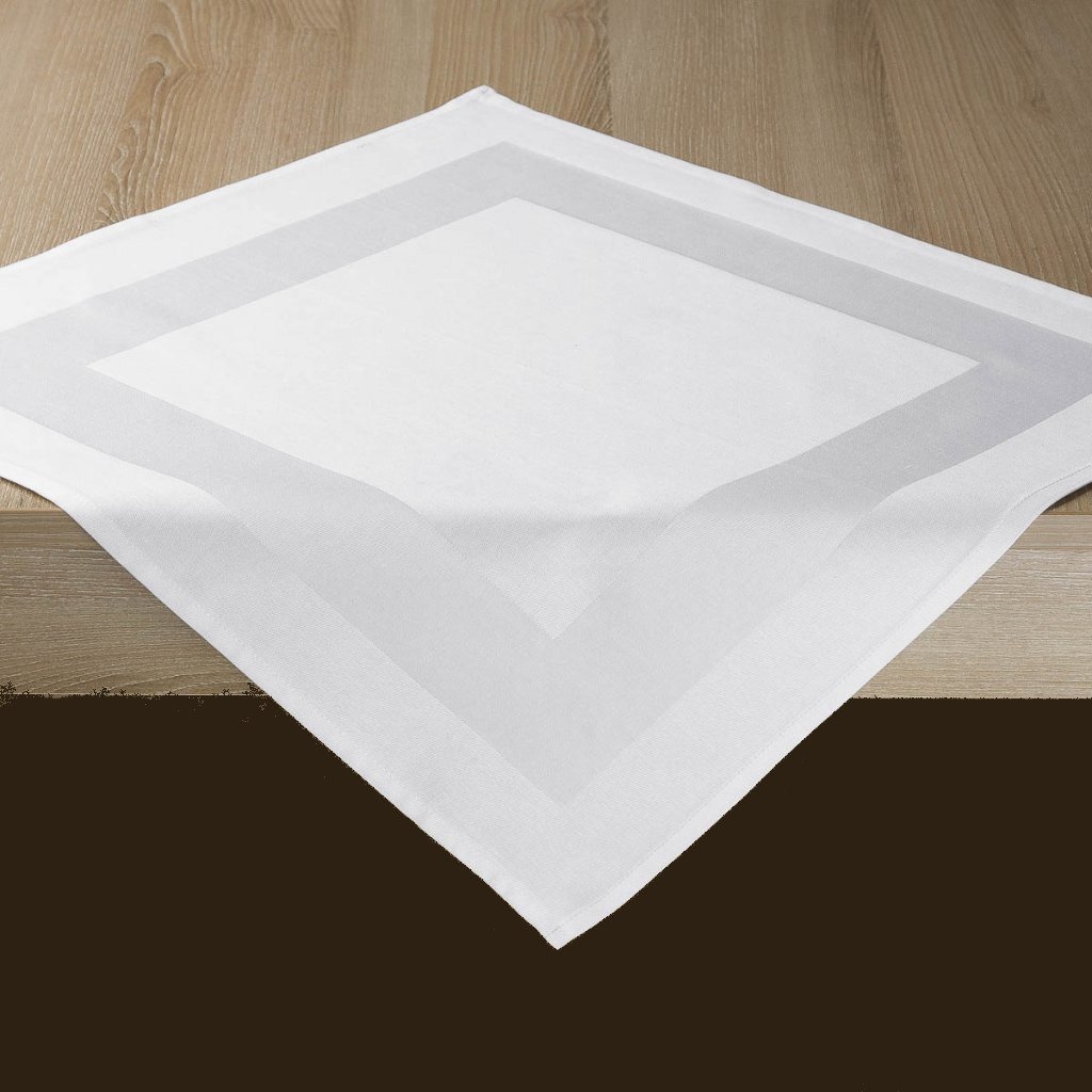 This square table topper 90x90 cm in white from our Padua collection features a surrounding satin band.
