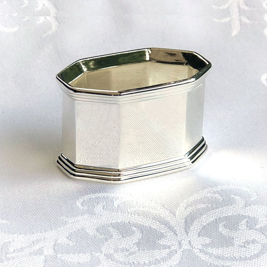 The silver napkin ring Louisa impresses with its timeless, classic design: a subtle oval shape in an octagonal style, refined with three delicate grooves at the top and bottom edges. This napkin ring is solidly crafted, highly polished, and finished with premium silver plating. It is perfectly suited for large, thick fabric napkins (50x50 cm) and pairs beautifully with minimalistic, modern tableware.